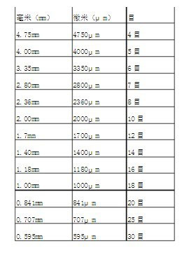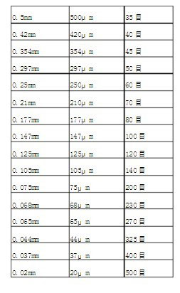 10目等於2.00毫米;12目等於1.70毫米;14目等於1.40毫米;16目等於1.18毫米;18目等於1.00mm;20目等於0.841毫米等等。目數和毫米有個轉換關係,目數的概念是這樣產生的:“目”是指每平方英寸上有多少個孔可以同時通過物料,