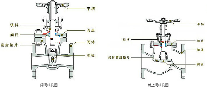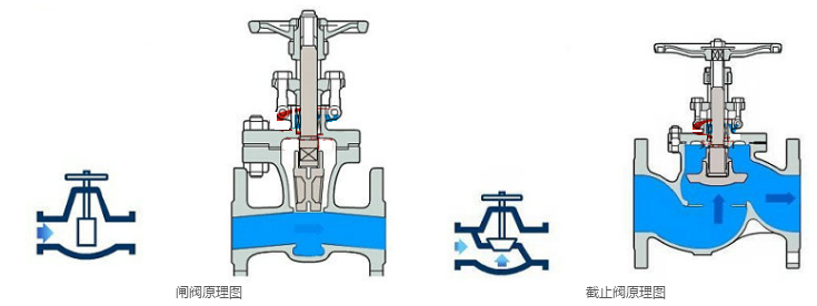 截止閥和閘閥在原理上的區別為,截止閥是上升閥杆式的,手輪跟著閥杆一起做旋轉和上升運動。閘閥是手輪旋轉,閥杆做上升運動。流量各不相同,閘閥要求全開或者全關,而截止閥則不需要。截止閥有規定進口和出口方向;閘閥沒有進出口方向要求。