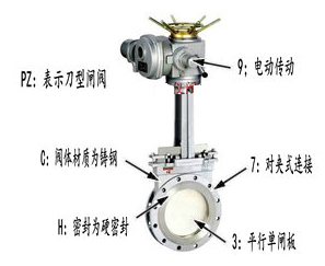 閘閥型號編製舉例: PZ973H-16C電動對夾式刀型閘閥
