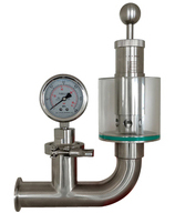該閥通過調整彈簧的調節蓋壓縮彈簧來校定一個特定壓力,在設備內壓力大於排氣閥校定壓力時,閥座自動彈起,設備係統中的壓力得到釋放,有效保護物料的發酵和容器係統安全。調節蓋上帶有壓力刻度值線,可根據用戶不用需求設置壓力。閥門帶有玻璃可視水封,可在玻璃桶內加注清水(注水漫過排氣口即可),在閥門釋放壓力時可看到玻璃桶冒泡。可另配壓力表。