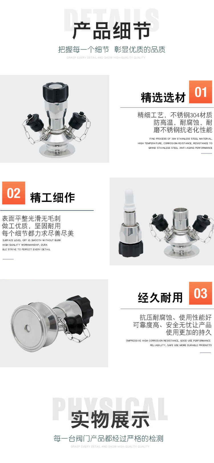 主要用于从罐或管道中提取样品。也可组装在罐底或管道底部,以排出留下来了。它适用于食品、化工、制药、化妆品和生物技术行业。以及所有其他需要卫生型设备的部门。