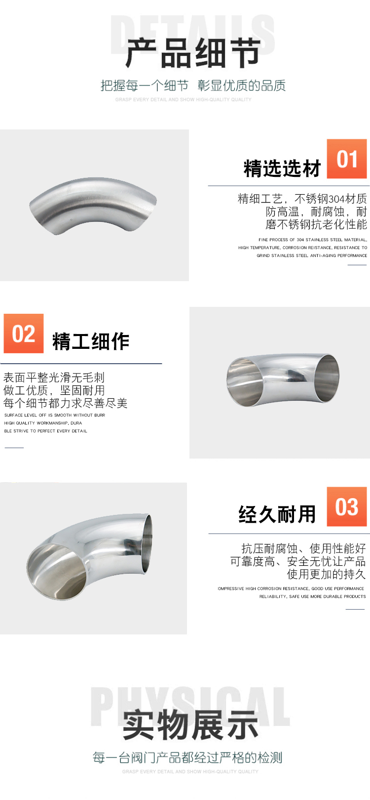 产品内外经高级抛光设备处理,达到表面精度要求,适用于乳制品、食品、啤酒、饮料、制药、化妆品等行业的不锈钢管道系统