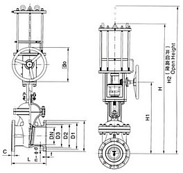 当使用气源操作闸阀时,必须将手动装置部位的小手柄扳到气动位置,使开合螺母与丝杆拨开,当压缩空气从汽缸上部管线入时,推动汽缸内活塞、活塞杆直线向下运动,活塞杆与阀杆连接,随之推动阀杆向下运动关闭阀门,当压缩空气从下部管进入时,气体推动汽缸内活塞、活塞杆向上运动,同时带动阀杆向上运动开启阀门。当无气源时,可利用丝杆及开合螺母进行开启和关闭阀门,先将汽缸的上下进气管处于排气状态,转动手动部位的小手柄处于手动位置,使开合螺母与丝杆处于正常啮合状态,此时转动手动部位的大手轮,当顺时针针转动手轮时,即关闭阀门,当逆时针转动手轮时,即开启阀门。