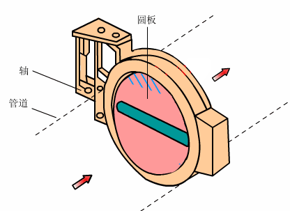 气动蝶阀通过压缩空气为动力源,驱动阀杆来控制圆盘形蝶板绕着轴线旋转,阀门初始位置根据实际需求而定,当阀门由初始位置旋转90°后即为一个动作结束(由开到关,或由关到开),反之为另外一个动作(由关到开,或由开到关)结束。