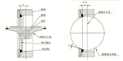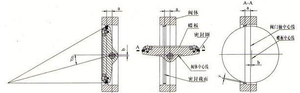 阀板回转中心(即阀门轴中心)于阀板密封截面形成一个A偏置,并与阀体中心形成一个b偏置;阀体密封面中心线与阀座中心线(即阀体中心线)形成一个角度为β的角偏置。