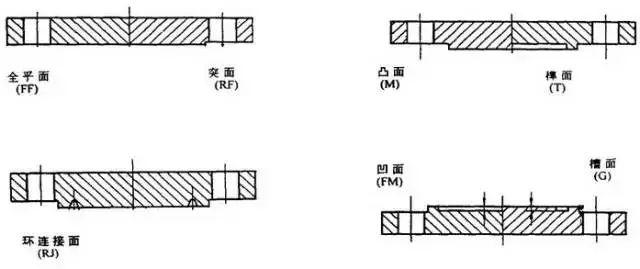 平面(FF)、突面(RF)、凹凸面(MFM)、榫槽面(TG)、环连接面(RJ)