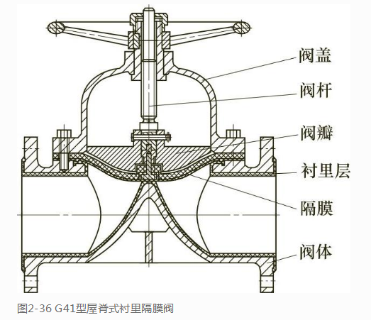 隔膜阀的结构隔膜阀主要由阀体、阀盖、阀杆、隔膜、阀瓣、衬里层及传动装置等组成。图2-36所示是常用的屋脊式衬里隔膜阀。