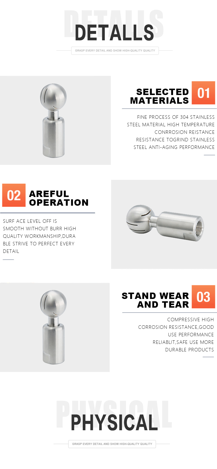 Spray balls are mainly used to spray strongly and clean inside of tank,generally, in field of food-processing, beverage, beer, pharmaceutical industries.
